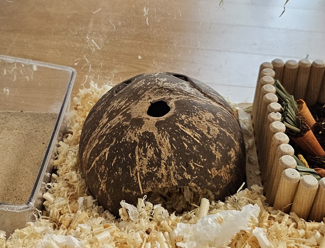 저는 현재 햄요미에게 은신처 3개를 제공하고 있습니다. 하나는 깊은 바닥재 쪽에, 하나는 케이지 반대편에, 하나는 비교적 개방된 위치에 두었습니다. 관찰해 보니 햄요미는 상황에 따라 다른 은신처를 사용하고 있습니다.
